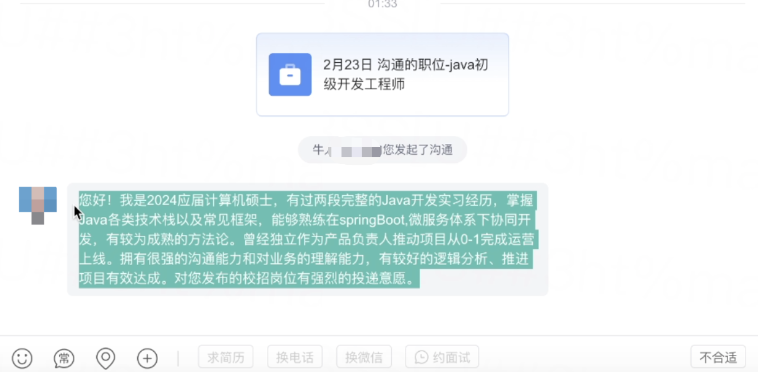 上面我们说了,HR 每天会收到一大堆简历,而且 HR 还无法直接看你的简历附件,那我们在投递的时候,如果能够在打招呼的时候,就直接介绍个人的优势,那就最好了。