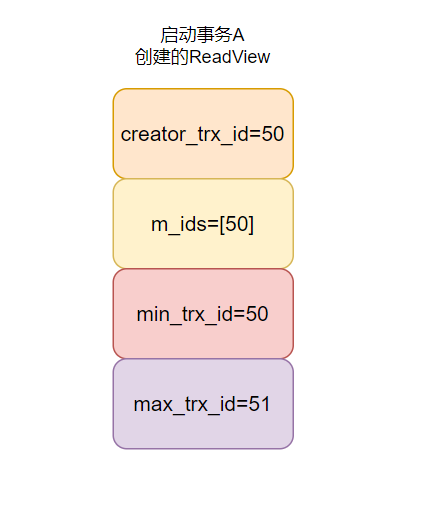 在这个 ReadView 中,它的事务 ID 是 50 ,由于它是第一个启动的,所以此时活跃事务的事务列表就是[50],并且活跃事务列表中的最小事务 ID 是 50,下一个事务 ID 是 51 。