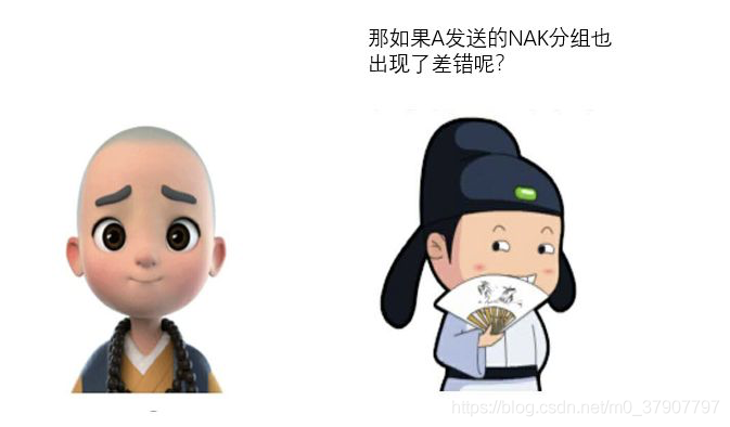 当计算机A收到接受方的反馈之后,如果收到的是ACK分组,那么就继续发送下一个分组数据。如果收到的是NAK分组,那么就重新传输这个分组。